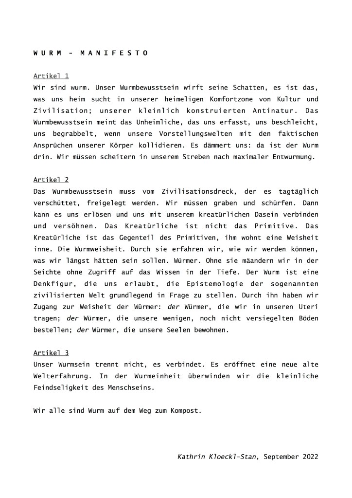 In den druckgrafischen Arbeiten der Reihe wir : wurm umkreist Kathrin Kloeckl-Stan die Themenfelder der kreatürlichen Identität und unser Verhältnis zur „Natur“. Dabei führt sie den Begriff des Wurmbewusstseins ein und proklamiert in ihrem Wurm-Manifesto: Wir alle sind Wurm auf dem Weg zum Kompost.